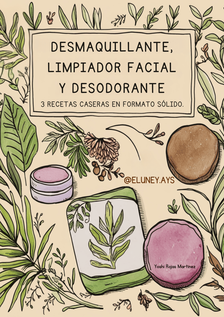 Este manual reúne tres recetas caseras en formato sólido: Desmaquillante, limpiador facial y desodorante natural. Con ingredientes como manteca de karité, aceites vegetales, arcillas y cera de abejas, aprenderás a crear productos efectivos, amables con tu piel y libres de químicos sintéticos.